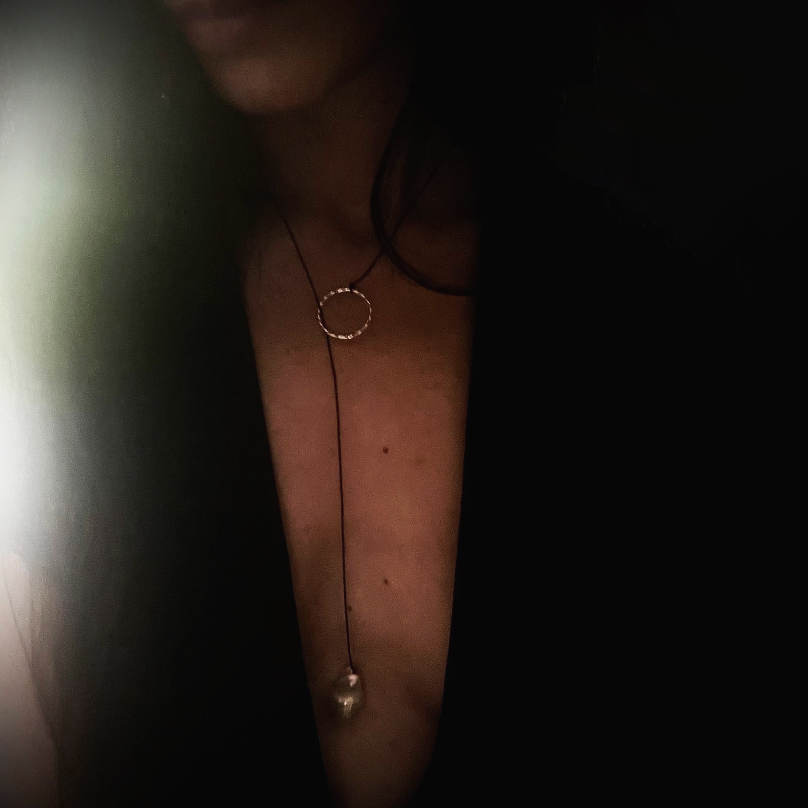 Perla baroc mereu unica pe snur negru si cerc argint / sau suflat cu aur.